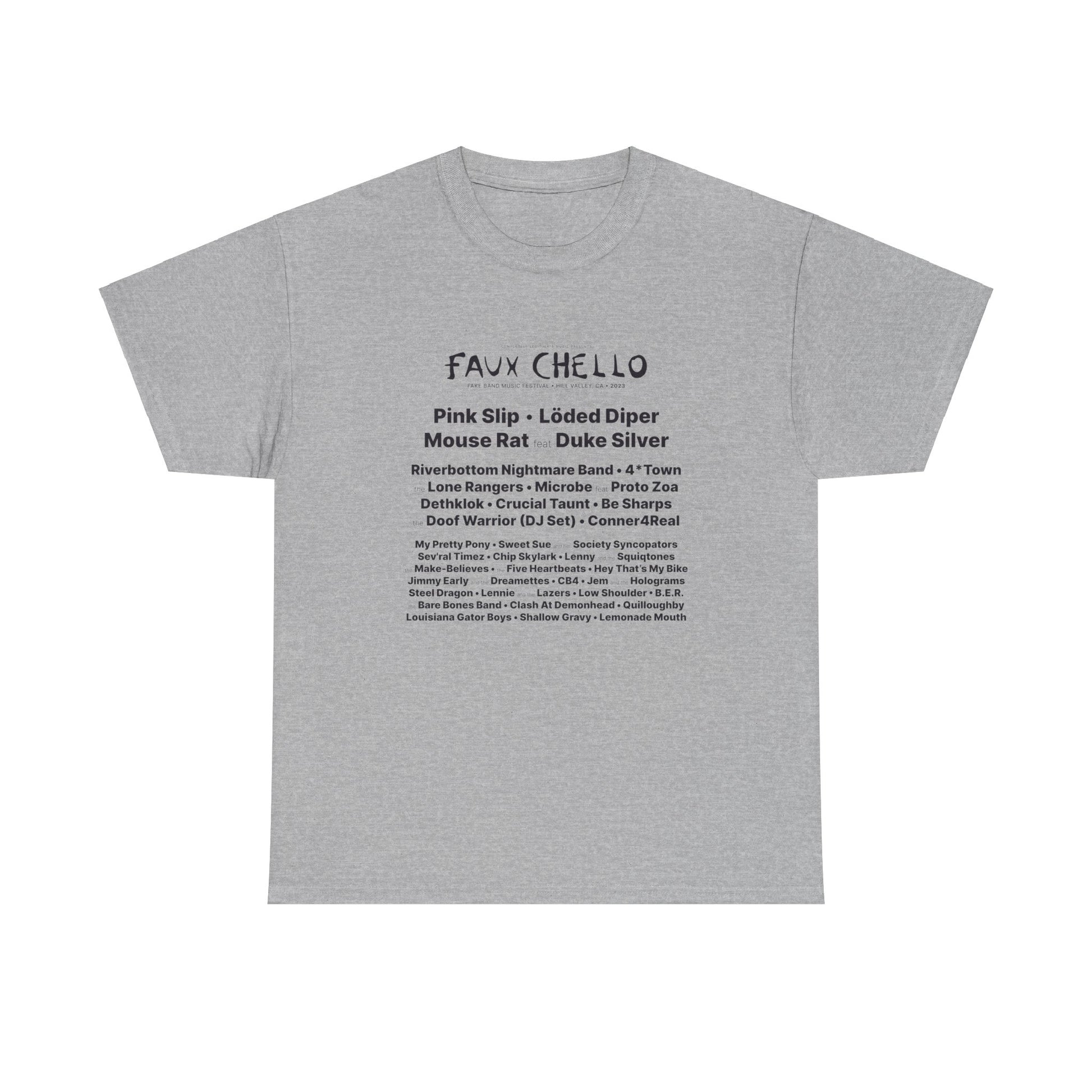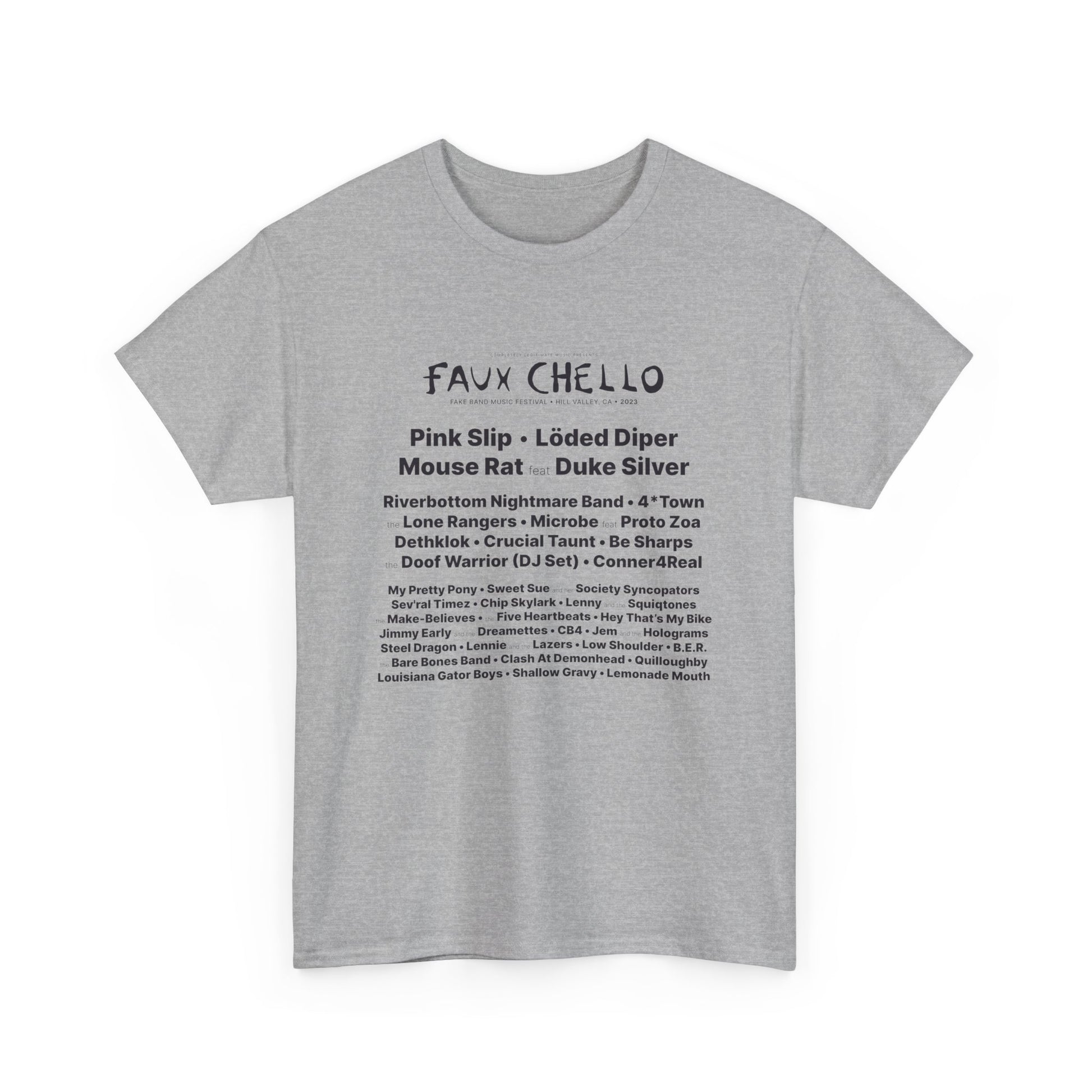 The greatest fake music festival of all time is back! All of your favorite fake bands got together and played a massive festival in the California desert again this year and you were there, or at least that's what people who see your cool-ass t-shirt will think. It's a murderers-row of musical acts that don't actually exist: Pink Slip, Löded Diper, and Mouse Rat featuring very special guest Duke Silver. Plus many more! Available in light and dark, just like your personality.
