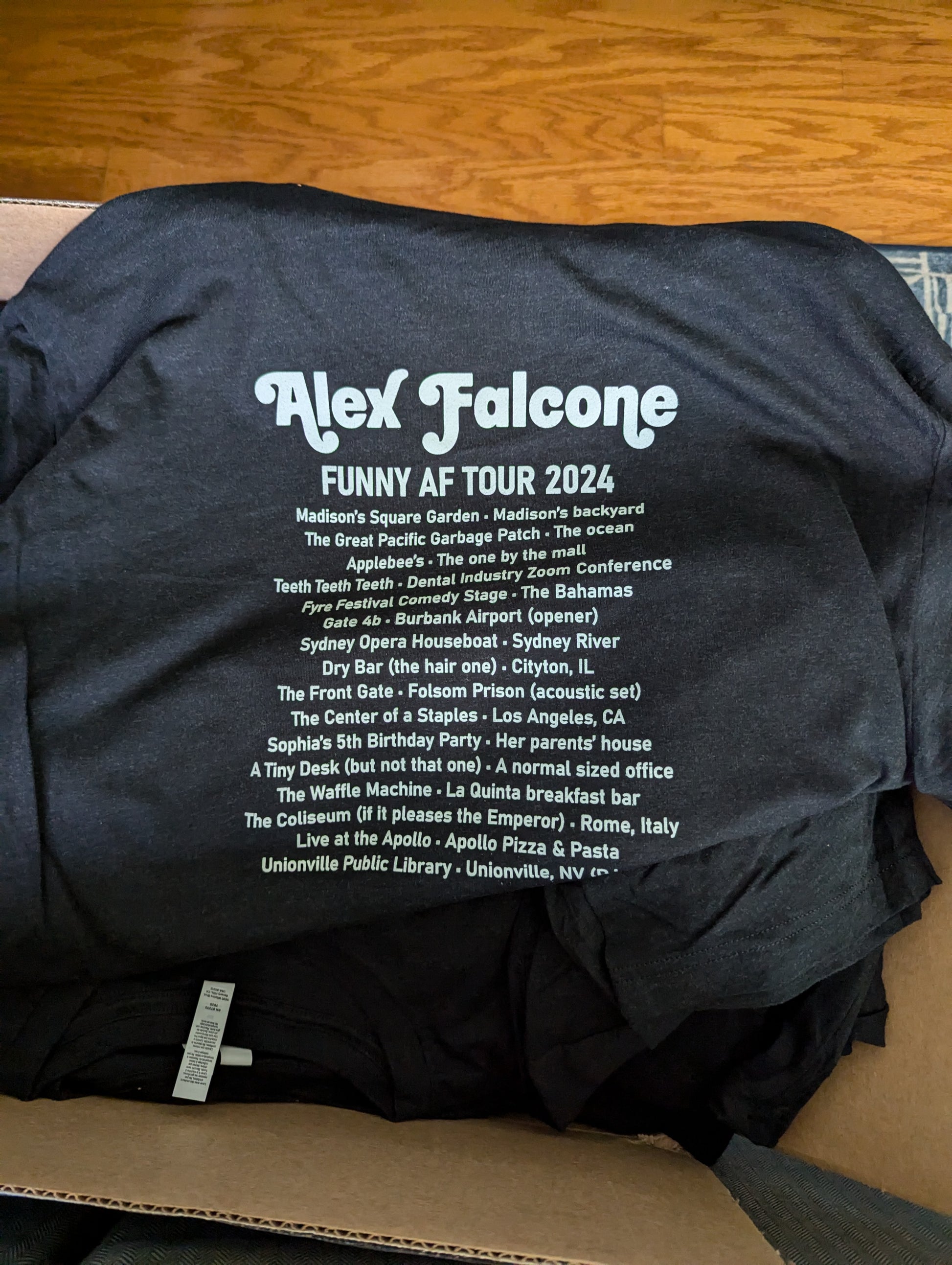 The first ever Alex Falcone tour shirt but instead of all the cool places I'm playing, it's the bad gigs. What a funny idea! And because my brain is bad, I forgot to design something for the front of the shirt so it's just the back. Show your support for me but only to people standing behind you!